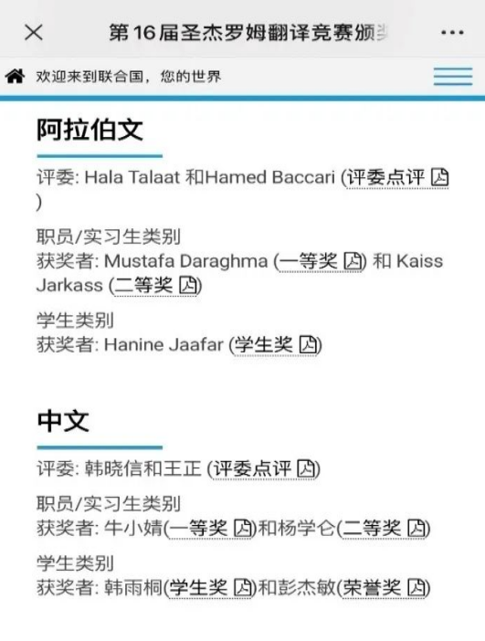 第16届联合国圣杰罗姆翻译竞赛获奖名单截图