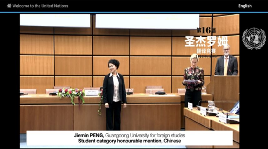 2023年10月4日,第16届联合国圣杰罗姆翻译竞赛颁奖典礼在联合国维也纳办事处(UNOV)举行,我校高翻学院硕士研究生彭杰敏获英译汉学生组别荣誉奖(二等奖)。