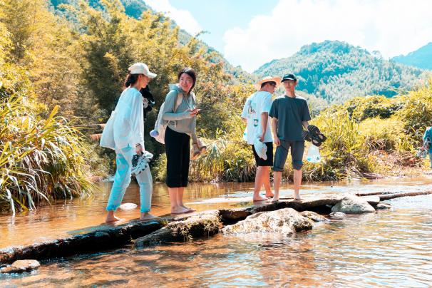 24日上午,同学们来到溪头村开启了一场长达5km的野外徒步。茂密的树荫是天然的遮阳伞,一行人穿梭于山野的小路中,就像是走在夏日的天然氧吧里。同学们一路说说笑笑,穿越郁郁葱葱的竹林,来到响水潭前聆听大自然的声音,光着脚丫穿过清凉的小溪流。一路上溪水潺潺哗哗作响,不时有清风拂面,送来一丝清凉。随后,同学们一同前往果园采摘番石榴,在欢声笑语中品尝劳动后番石榴的清甜。