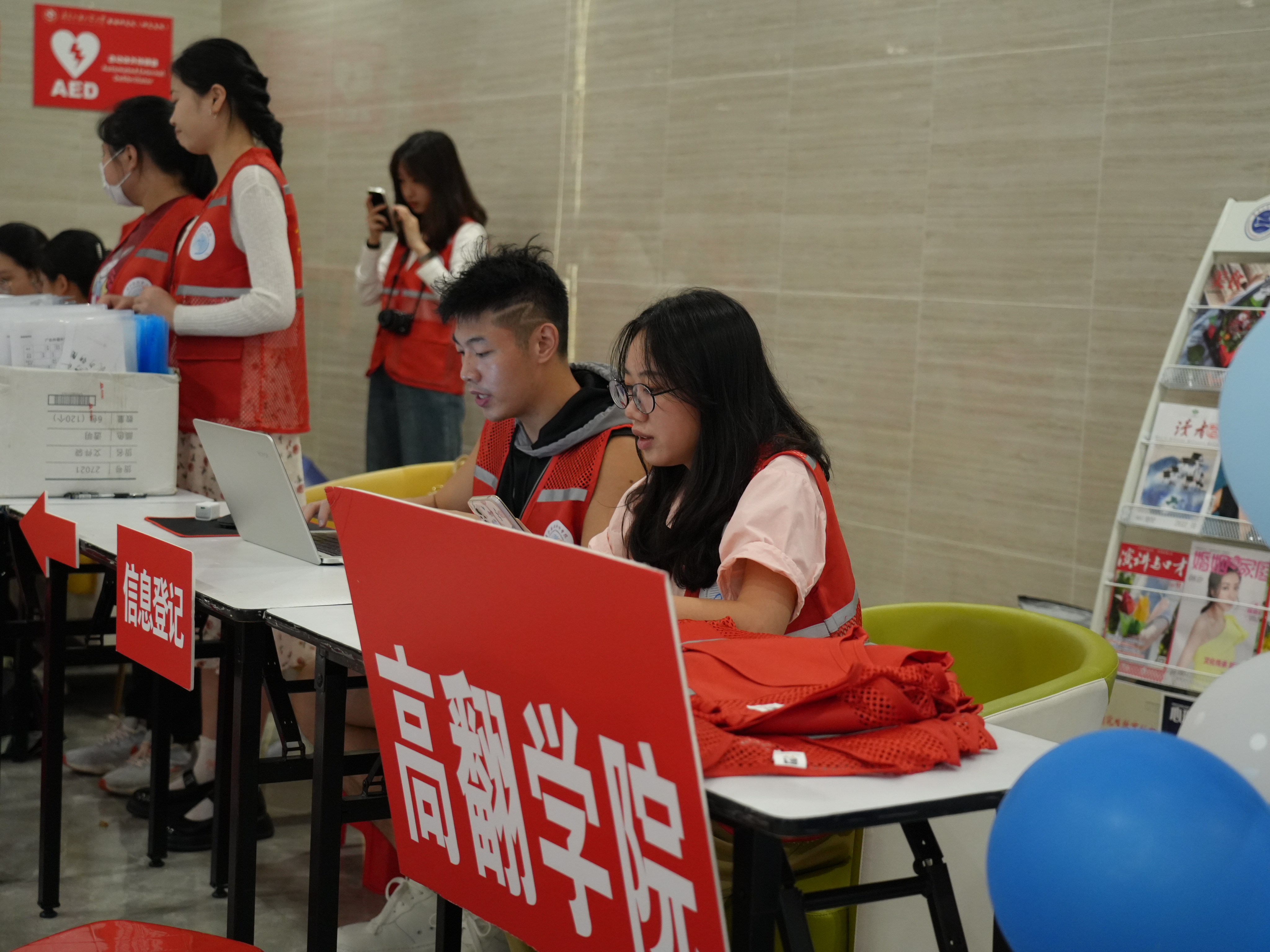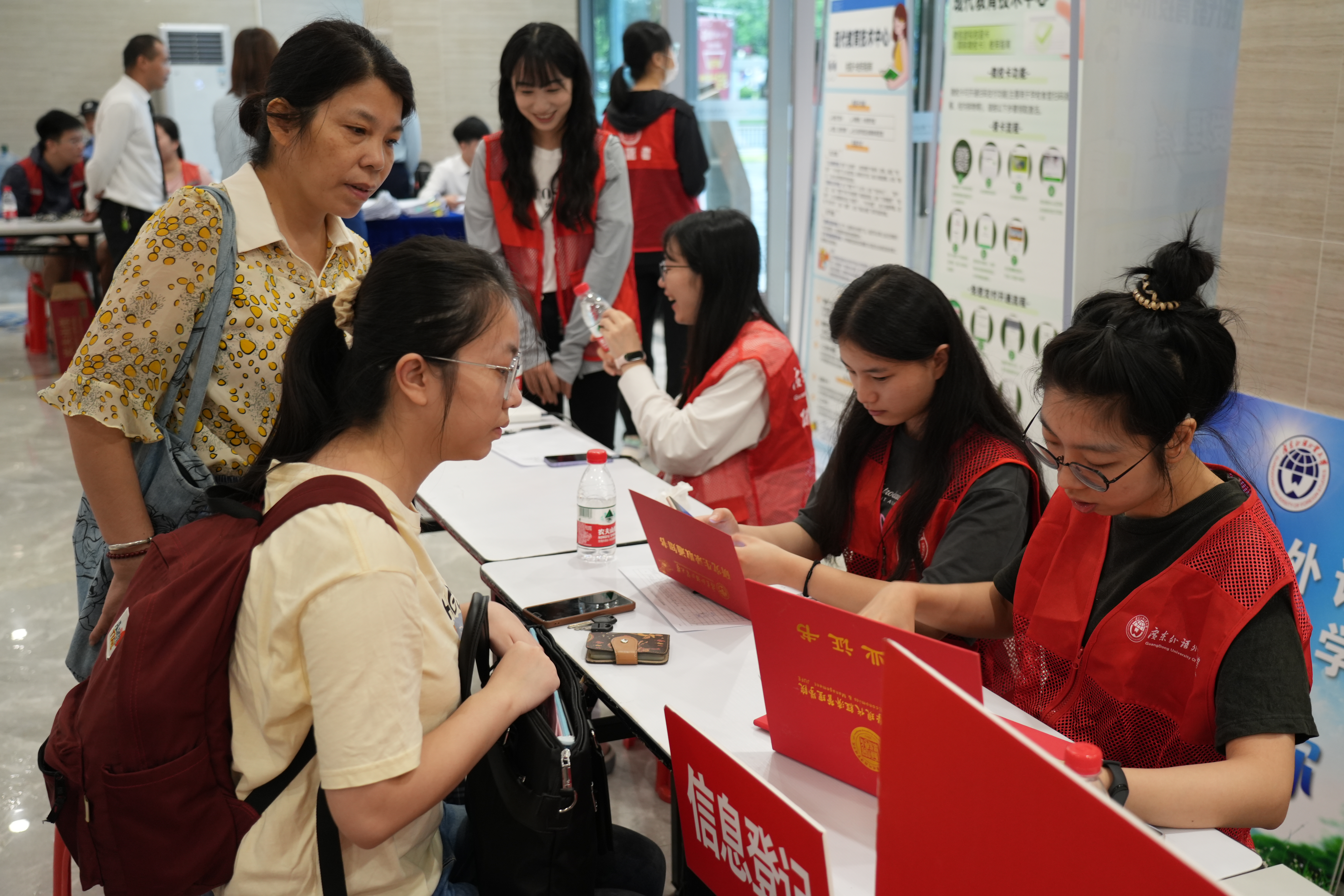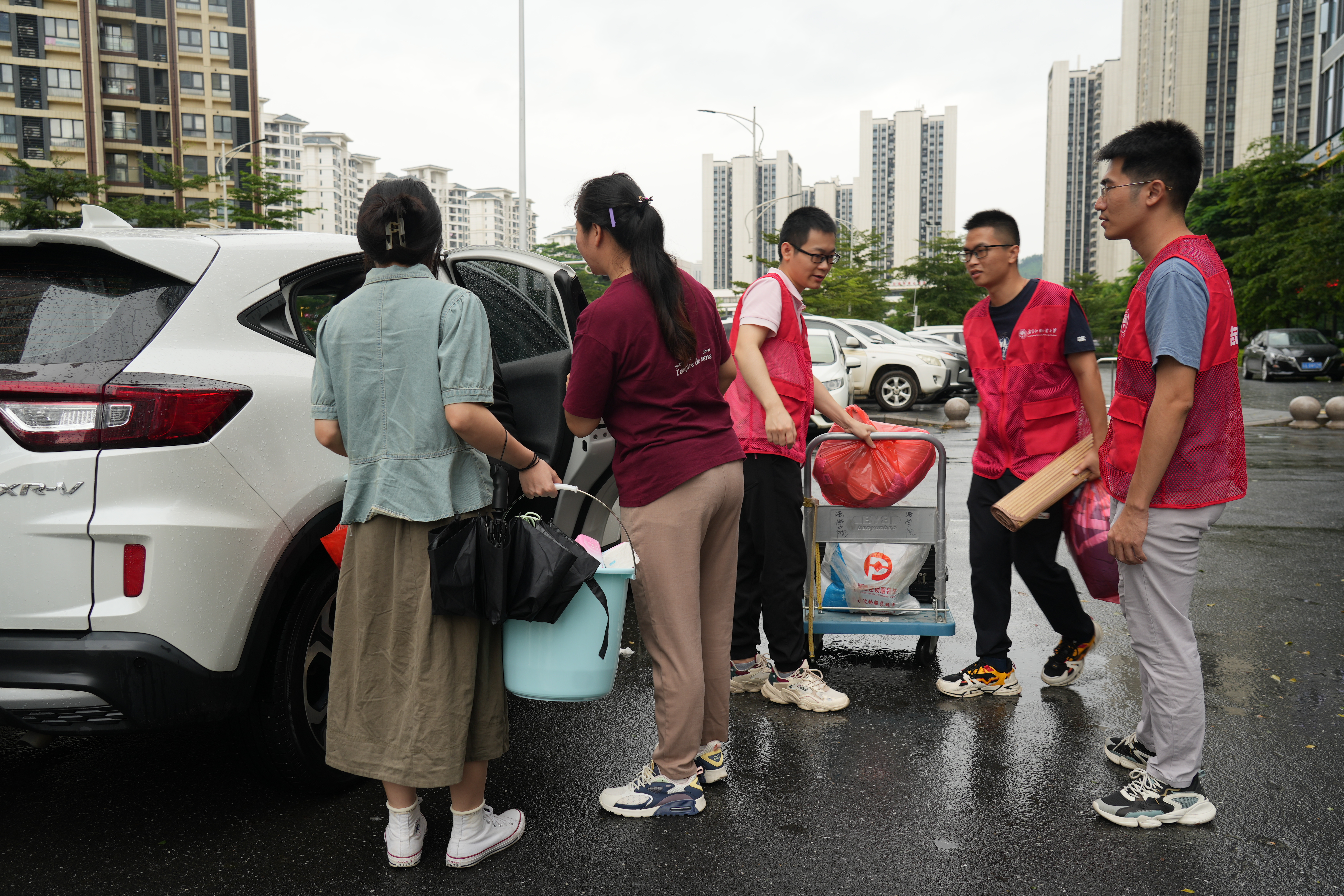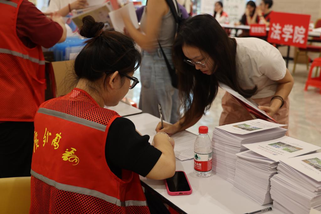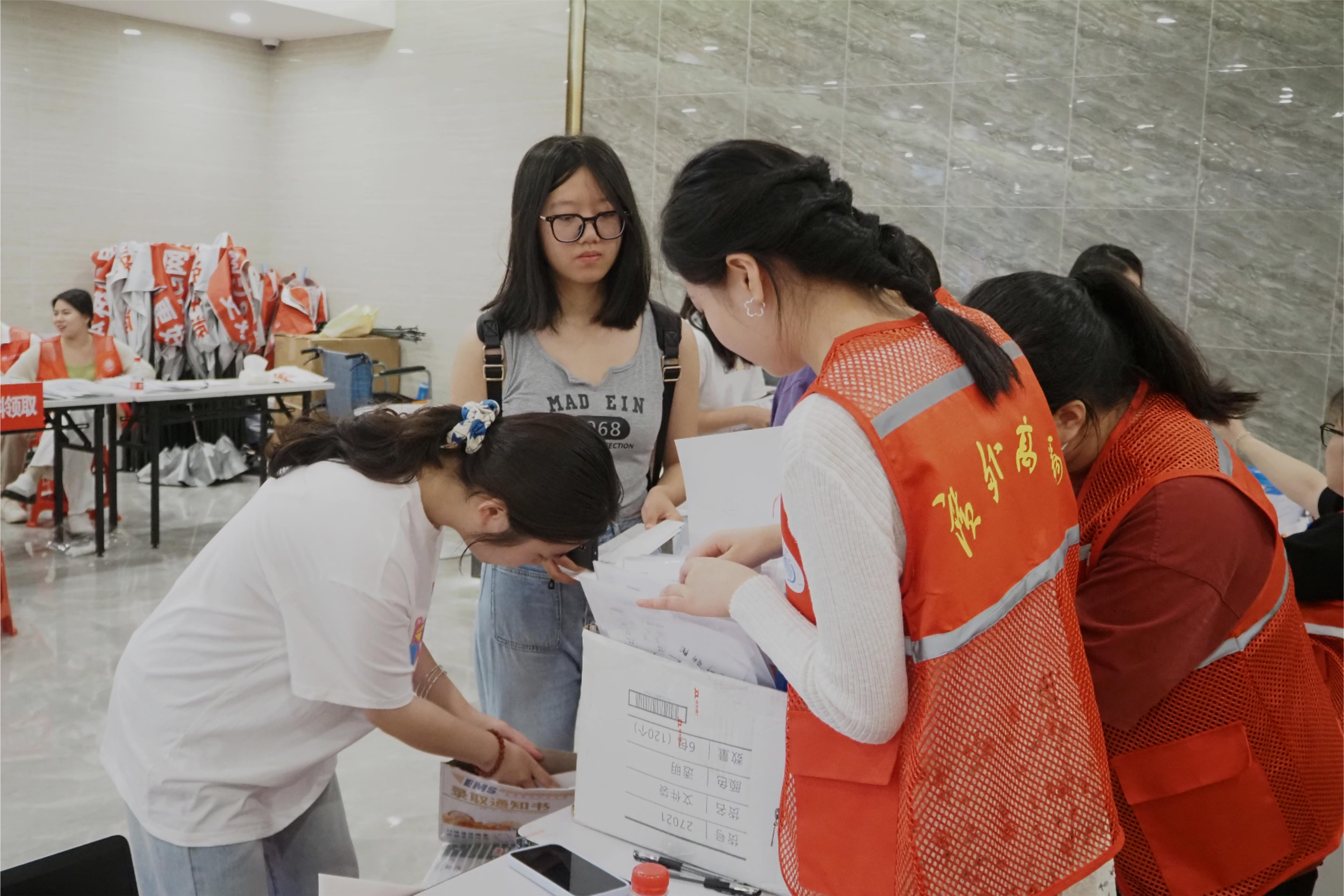 上午8时许,志愿者们已在迎新大厅内外设置摆放了清晰的标识,确保新生报到工作有序开展。园区内,身穿红马甲志愿者的身影穿梭其中,一切迎新准备井然有序。迎新大厅门口,多名志愿者倚门而站,红色身影一字排开,翘首以盼新同学的到来。