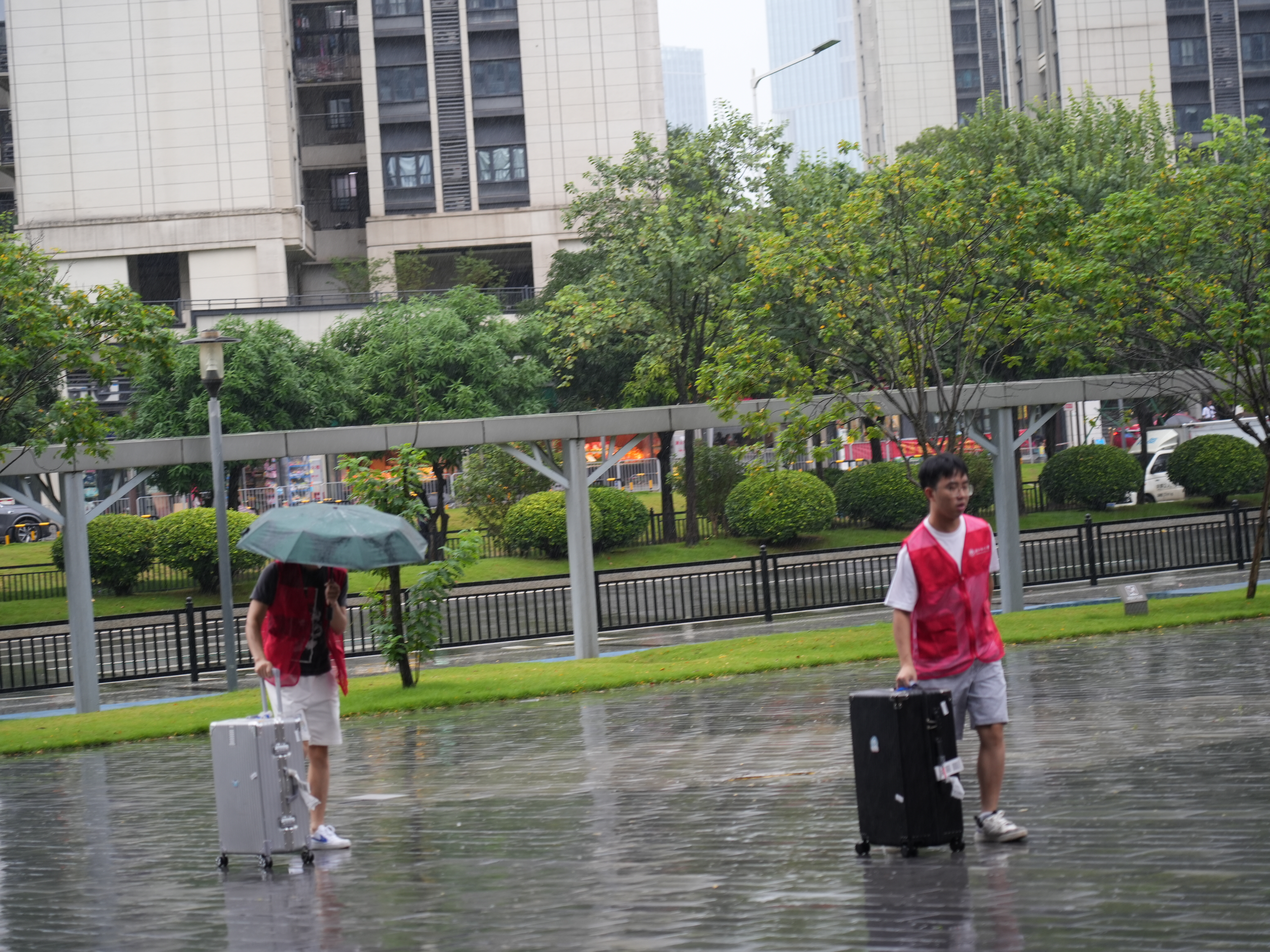 园区外小雨淅淅沥沥,但第一位新生也随着雨的脚步早早来到。随后,越来越多的新面孔踏入迎新大厅,志愿者们热情上前询问,一问一答间,略带腼腆的面容与明媚的笑容撞个满怀。雨势倏大倏小,新生们陆续而来,体贴的迎新志愿者们快步撑伞前迎,接过行李,新生和家长们粲然一笑以表感谢。跟着标识来到对应的学院报到处,先信息登记,再领取相关资料,在志愿者的指引下,新生报到手续顺利结束。接着就是向宿舍前进啦!