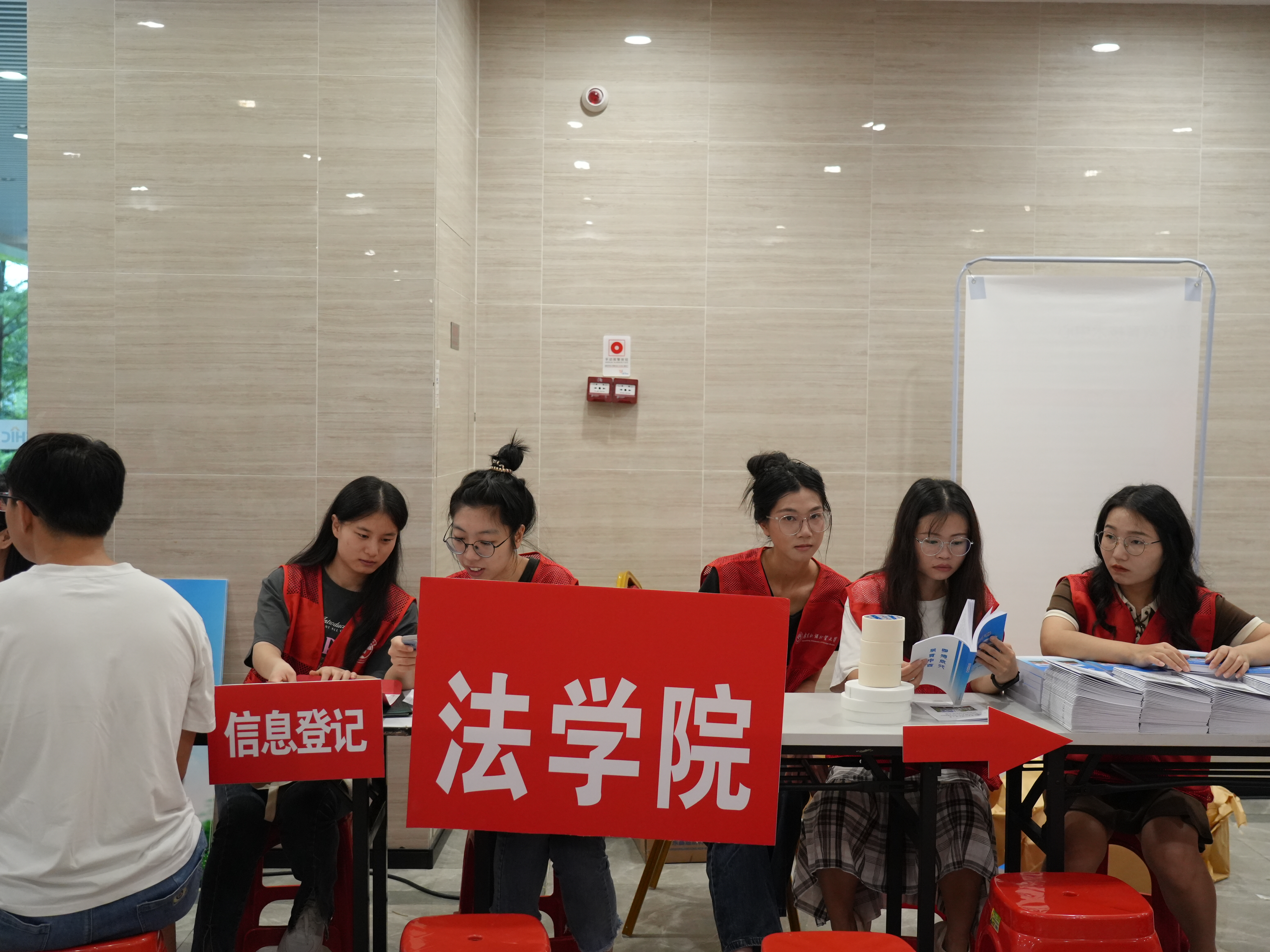 在迎新大厅,刘海春与法学院、高翻学院迎新负责人交谈,询问迎新准备工作,并关心两个学院的新生情况与学生台风天安全到校情况等话题。