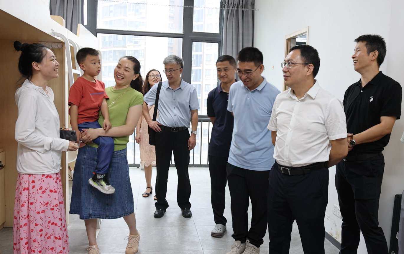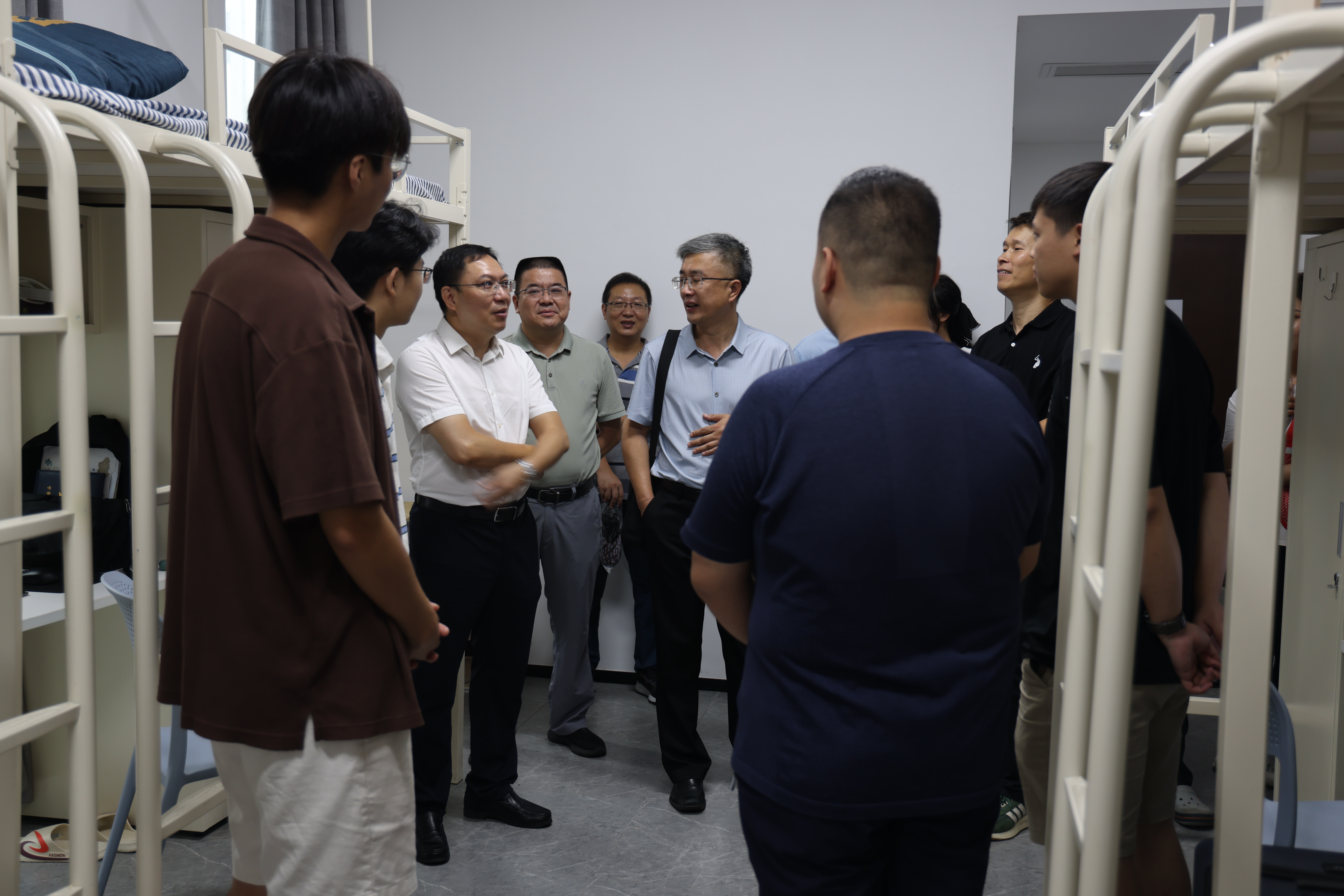 走访宿舍时,刘海春一行先后前往C2栋与D11栋新生宿舍,亲切问候入住新生,询问其入住感受,对新生的到来表示欢迎并对新生的学习和生活表示关心。此外,刘海春希望新生在知识城校区利用学校提供的丰富学习资源,努力进取,学业有成,未来可期。在走访过程中,一位新生与家长恰好推着行李来到宿舍,家长高兴地讲道:“知识城很漂亮,宿舍环境很好,一切都很满意。”