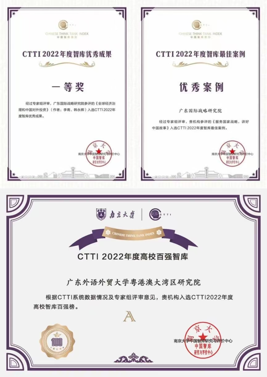 8月,广东国际战略研究院位列中国智库榜单第23位,是广东省唯一一家进入前30名的智库。12月,广东国际战略研究院成果与案例分别获CTTI智库优秀成果一等奖与智库建设优秀案例。粤港澳大湾区研究院入选CTTI高校智库百强榜。年内,承担了纵向科研项目52项,其中国家级项目6项,省部级项目21项,厅级项目9项;横向科研项目45项,获资助科研项目总经费1432.5万元。发表学术著作16部,论文131篇,其中一类期刊论文25篇,二类期刊及以上论文61篇。1项成果获商务部发展研究成果奖(2021年)二等奖,3项成果获省级学术团体奖。服务决策咨询方面,共有咨询报告26篇被采纳,其中获中央领导同志批示3篇。