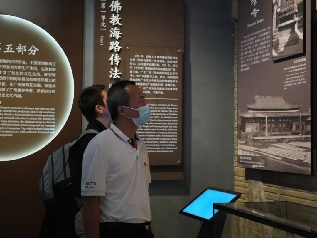 沧溟八千里,海丝万里不扬波。博物馆展厅利用现代化技术全方位地展示了海上丝绸之路的历史背景、发展历程以及文物历史资料。讲解员声情并茂地讲述着“千年商都”的辉煌成就,勾勒出黄埔区灿烂的史前文明画卷。一件件展览的文物,诉说着丝路上的动人故事,党员们身临其境地感受着丝绸之路的繁盛景象。