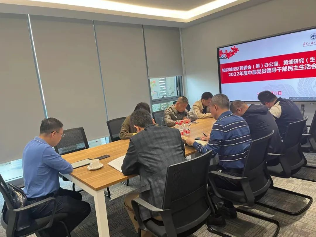 知识城校区管委会(筹)办公室和黄埔研究(生)院党员领导干部汤程荣、陈坚志、王淑君、张秀三、钟雄波紧扣“全面贯彻习近平新时代中国特色社会主义思想,深刻领悟‘两个确立’的决定性意义,增强‘四个意识’、坚定‘四个自信’、做到‘两个维护’,团结带领党员干部群众以奋发有为的精神贯彻落实党的二十大作出的重大决策部署”主题,依次进行个人对照检查,严肃认真开展批评和自我批评。与会人员相应发言,对领导干部提出批评意见。