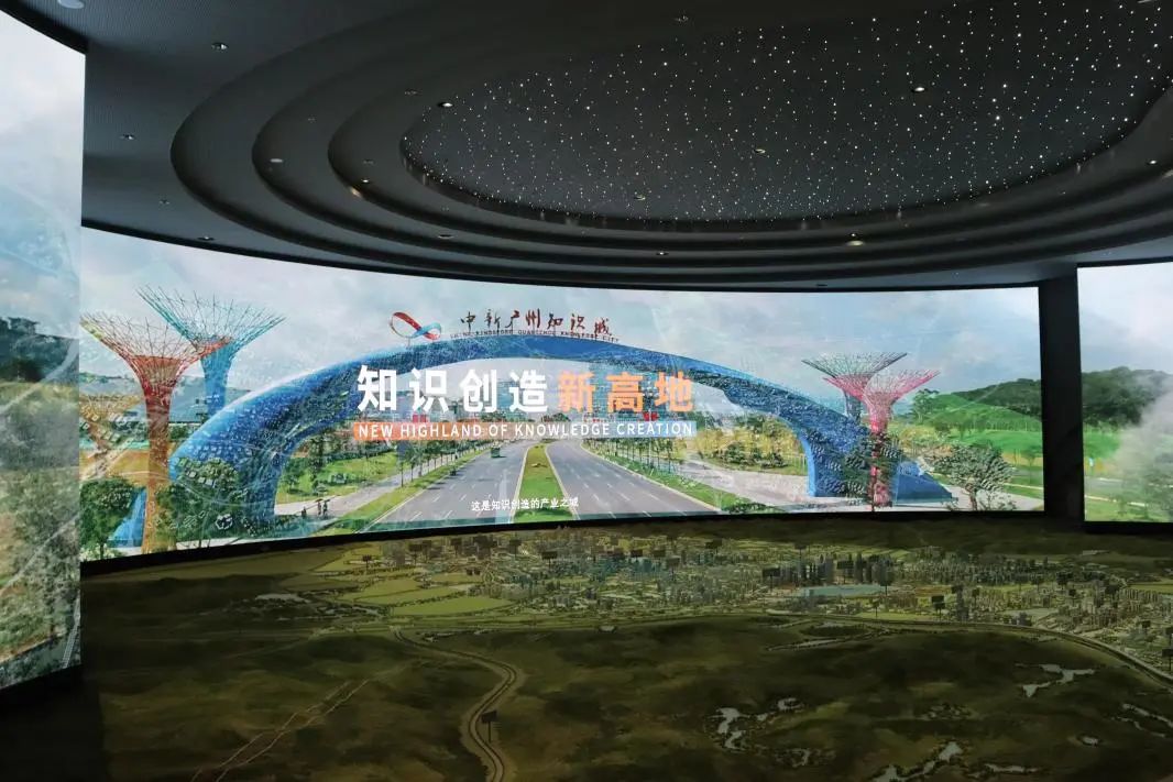 活动的首站是粤港澳大湾区知识创新策源地——中新广州知识城发展规划馆。刚一进馆,巨大的中新广州知识城总规划沙盘模型便映入眼帘,具有艺术结构的巨型LED屏放映着知识城的发展历程,加上地幕投影和灯光氛围的点缀,沙盘将具有“湾顶明珠”美称的知识城的风采具象地表现出来。馆内穹顶是繁星点点的天幕,星光汇聚在纵向1:900,横向1:660比例的总规划沙盘上,232平方公里的知识城缩影便展现得淋漓尽致。