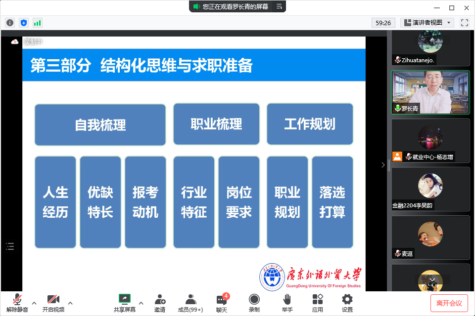 10月28日下午,由广东外语外贸大学黄埔研究院和学生就业指导中心联合举办的“职引未来”职业分享沙龙第十期在线上顺利举办。广东外语外贸大学中国语言文化学院教授罗长青应邀为黄埔研究院研究生开展主题为“结构化思维和应聘能力提升“的培训讲座。本次分享会由就业指导中心老师杨志增主持。