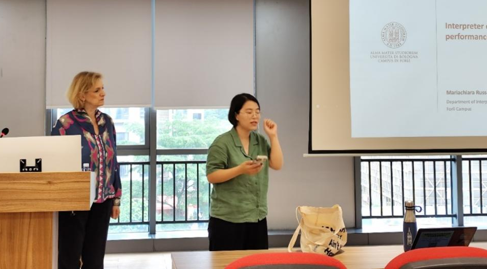 讲座伊始,Mariachiara Russo教授首先探讨了欧洲口译教育的最新动态和前沿趋势,展示了口译培训领域的创新成果。她详细解读了欧洲口译教育的EMCI模型,该模型是欧洲会议口译教育的典范,旨在培养具备高度专业素养的会议口译人才。随后,她进一步介绍了博洛尼亚大学翻译系会议口译硕士项目(MA in Conference Interpreting)。她特别提到,为了满足新时代市场的多样化需求,博洛尼亚大学还设立了传播口译与技术(InTeCo)项目,该项目致力于培养既掌握现代技术又能应对多元化传播需求的口译人才。在分享项目详情时,Mariachiara Russo教授详细阐述了各项目的教学目标、课程设置和考试安排,还特别介绍了博洛尼亚大学为口译教学而开发的计算机辅助口译和口译教学软件及平台,这些工具为口译线上教学和口译自主练习提供了更多便利。