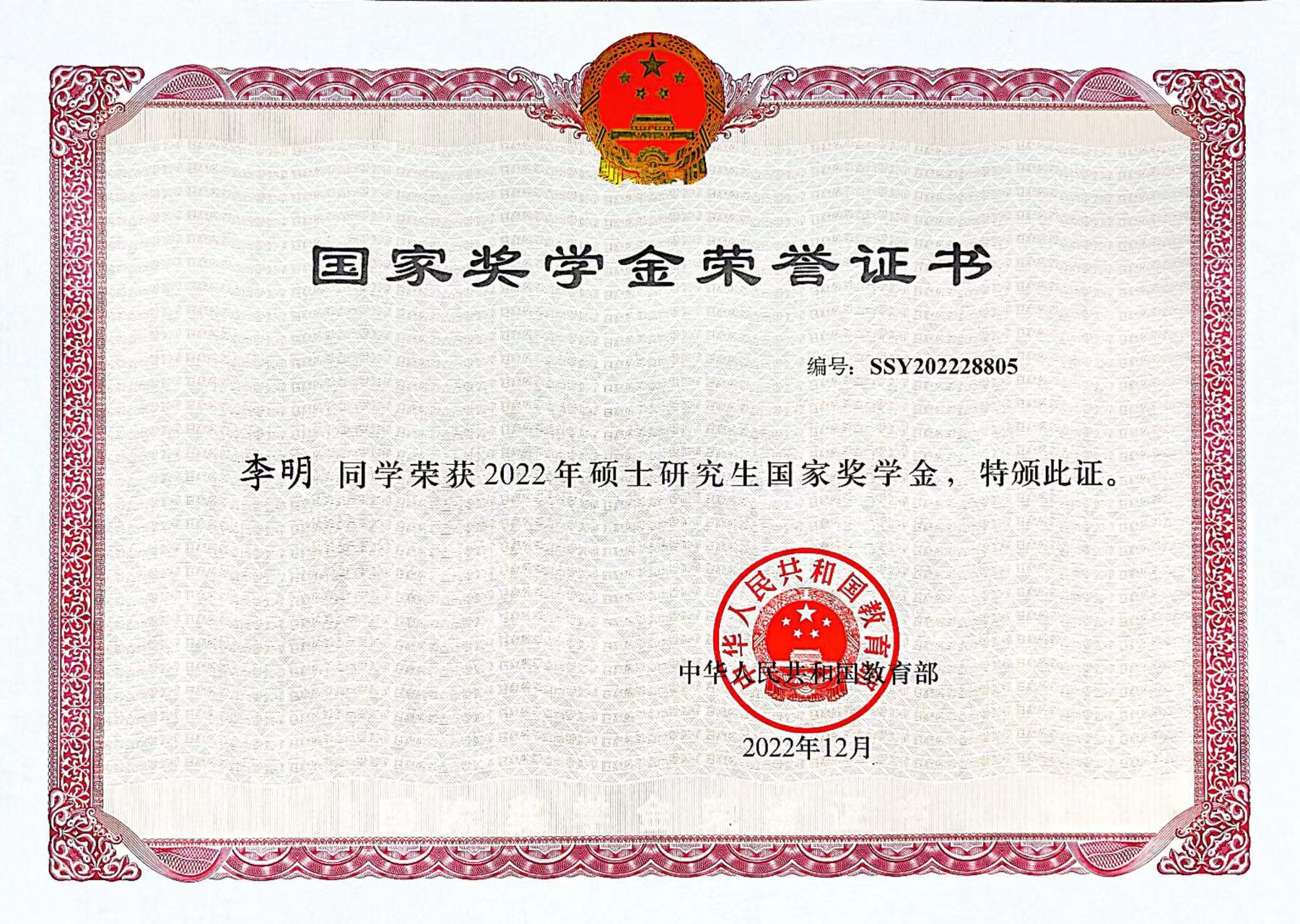 13.李明获2022年硕士研究生国家奖学金荣誉证书