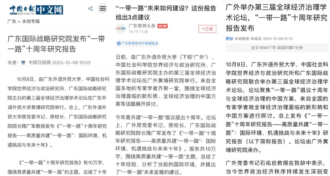 广东国际战略研究院发布“一带一路”十周年研究报告并受到多家媒体关注