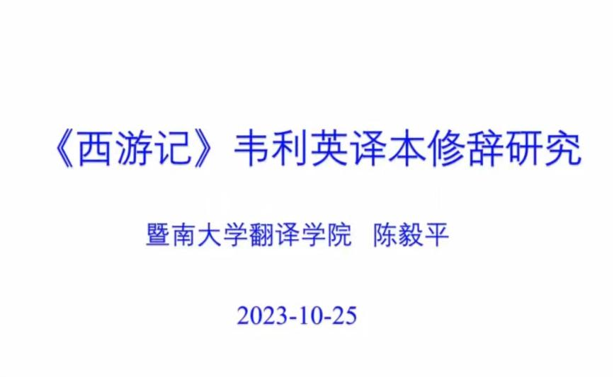 10月25日下午,由广东外语外贸大学黄埔研究院主办、广东外语外贸大学高级翻译学院承办的黄埔大讲堂第50讲在腾讯会议室举办。暨南大学翻译学院教授、副院长陈毅平应邀进行了题为“《西游记》韦利英译本修辞研究”的学术讲座。本次讲座由广东外语外贸大学高级翻译学院副院长王巍巍教授主持,为高级翻译学院师生及广大翻译爱好者提供了学习与交流的平台。