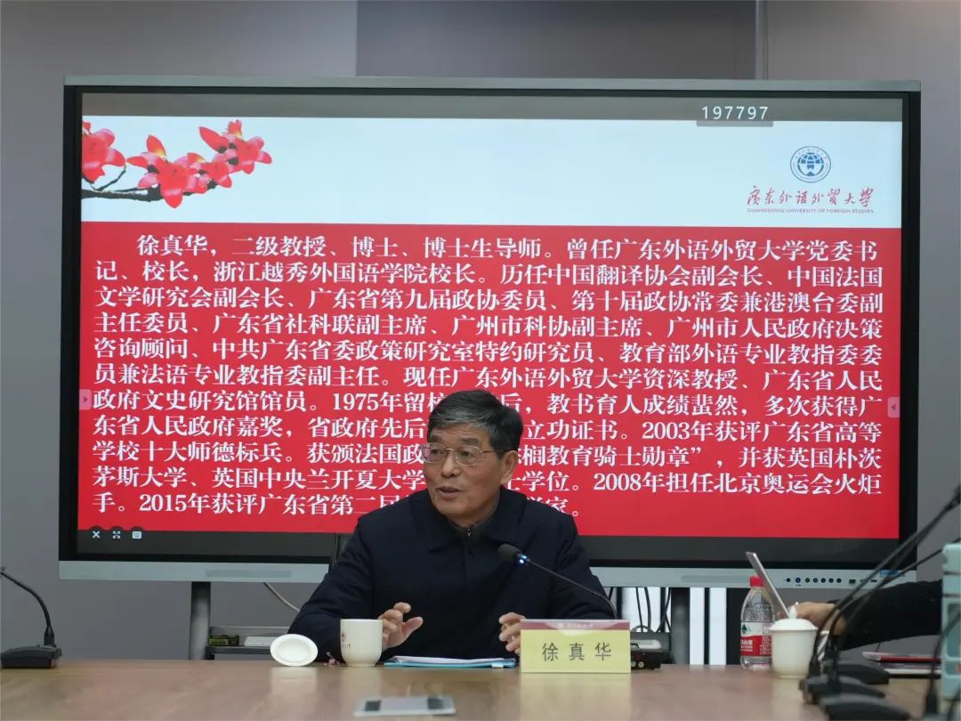 12月21日下午,由广东外语外贸大学黄埔研究院主办的黄埔红色大讲堂第4讲在进德楼第一会议室举办。曾任广东外语外贸大学党委书记、校长,现任广东外语外贸大学资深教授徐真华应邀进行“学术与人生”专题讲座。我院执行院长李青教授参加了本次讲座,讲座由知识城校区管委会(筹)办公室副主任汤程荣主持。