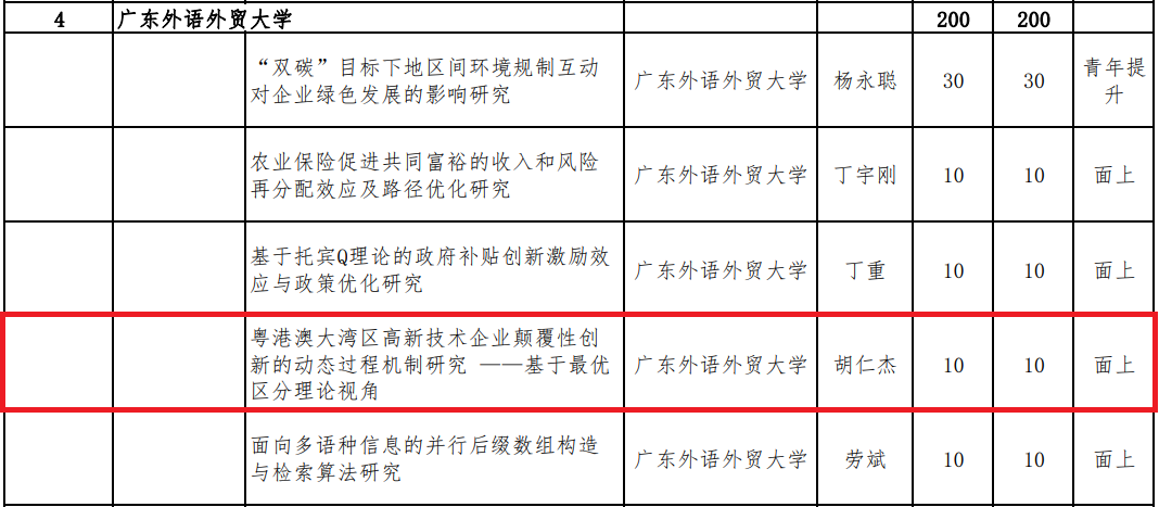1110日,广东省基础与应用基础研究基金自然科学基金立项结果公布,广东国际战略研究院共获得4项立项资助,其中胡仁杰老师获得2023年度广东省自科面上项目立项,项目名为粤港澳大湾区高新技术企业颠覆性创新的动态过程机制研究——基于最优区分理论视角孙照吉、马晶和裴丹3位老师获得2022年度广东省自科青年基金项目立项,项目名分别为商事制度改革影响企业创新的理论、效应与政策研究:基于企业生命周期视角“‘新基建新型基础设施:产业组织结构、市场结构与机制设计共同富裕视角下企业国际市场竞争与劳动收入份额研究