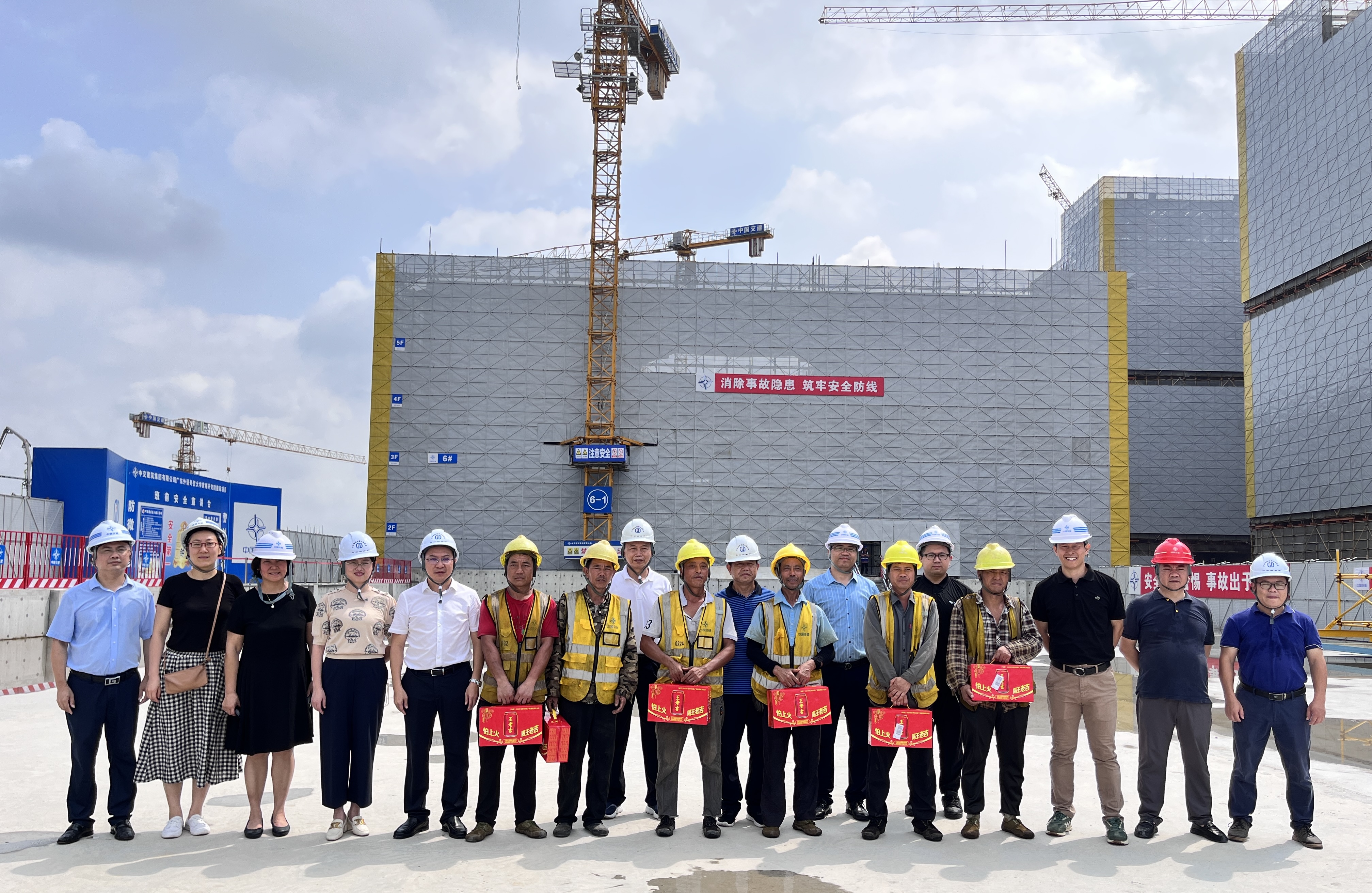 8月14日上午,我校党委常委、副校长、黄埔研究院院长刘海春率队来到知识城新校区建设工地现场,看望和慰问在高温下辛勤工作的一线员工,为他们送去防暑降温饮品。黄埔研究院、知识城校区管委会(筹)办公室、基础建设部等部门负责人参加慰问活动,通过暑期加快推进新校区建设,力求实现新校区建设的高质量发展。