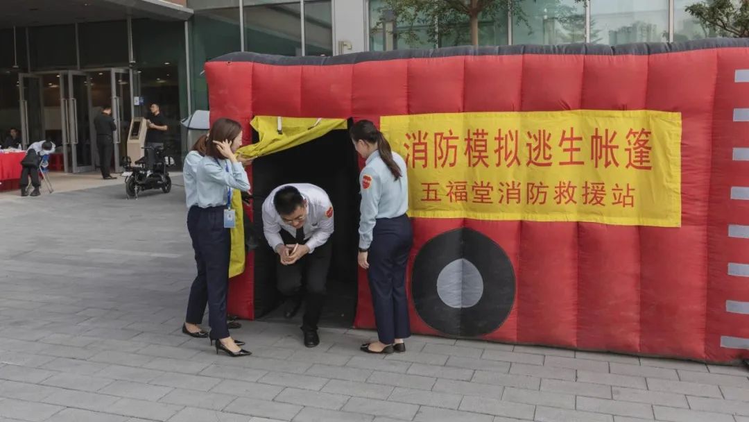 经过消防官兵的标准示范,在场同学、工作人员都积极参与了灭火实操体验。随后,在消防官兵的指导下,参与人员分组有序进入消防模拟逃生帐篷体验紧急逃生。