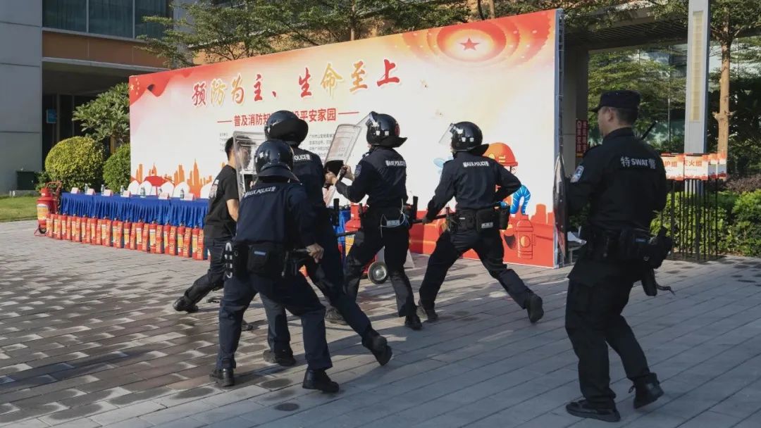 本次演习共分为四个环节,分别为模拟疏散逃生及现场救援、消防技能培训、灭火实操体验和应急反恐演练培训。