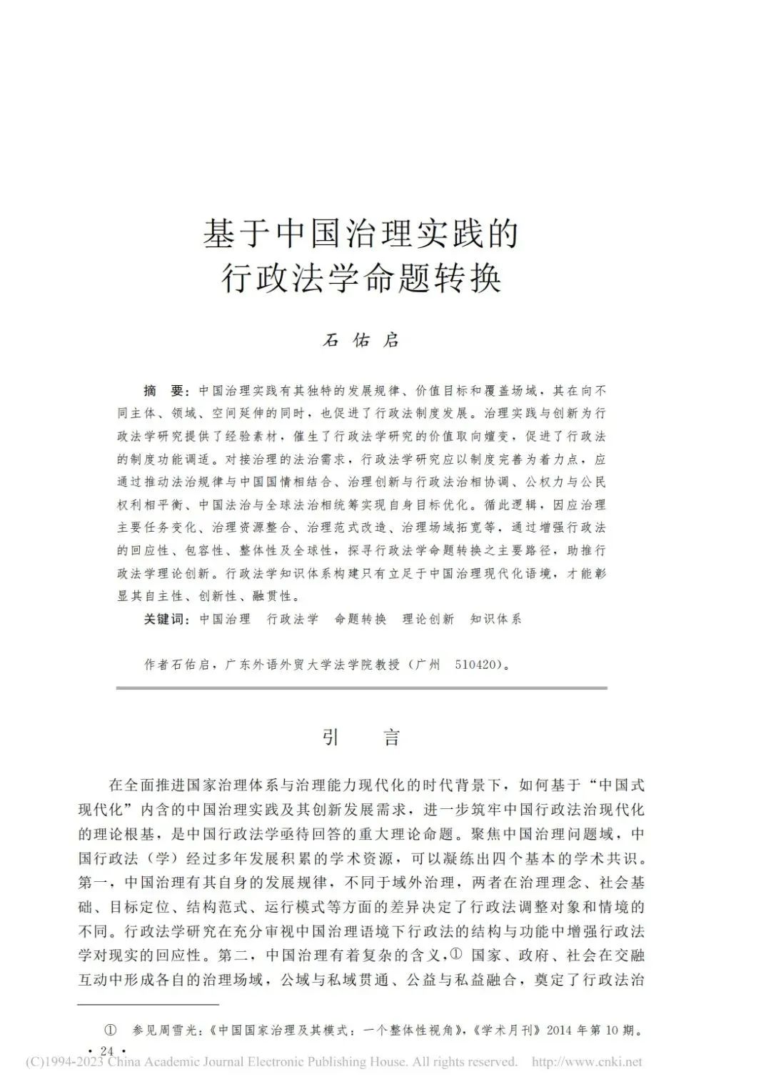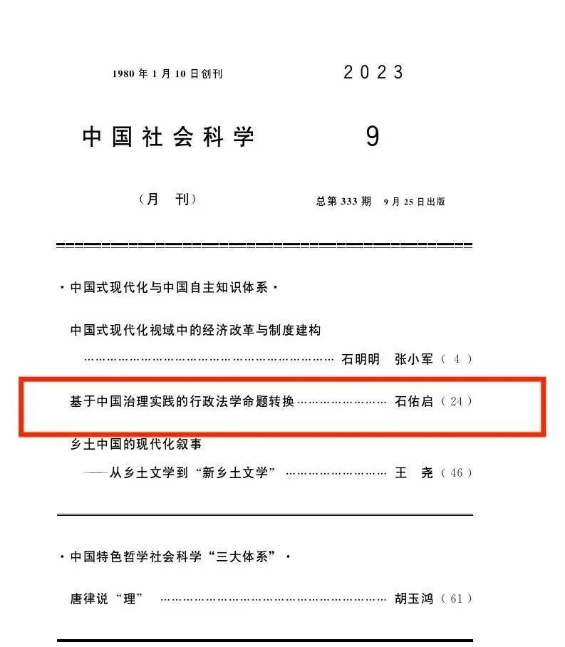 近日,我校石佑启教授在《中国社会科学》2023年第9期发表学术论文《基于中国治理实践的行政法学命题转换》。