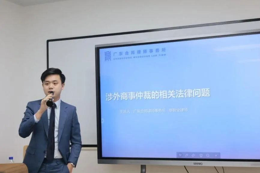 本次活动特邀马来西亚宾大斯专利事务所中国区主任、广东合邦律师事务所国际部副部长廖智全作“涉外商事仲裁的相关法律问题”主题培训,他从涉外商事仲裁的界定、仲裁临时措施、仲裁裁决的承认与执行等方面为同学们一一分析涉外商事仲裁的要点,分享多个实际案例。