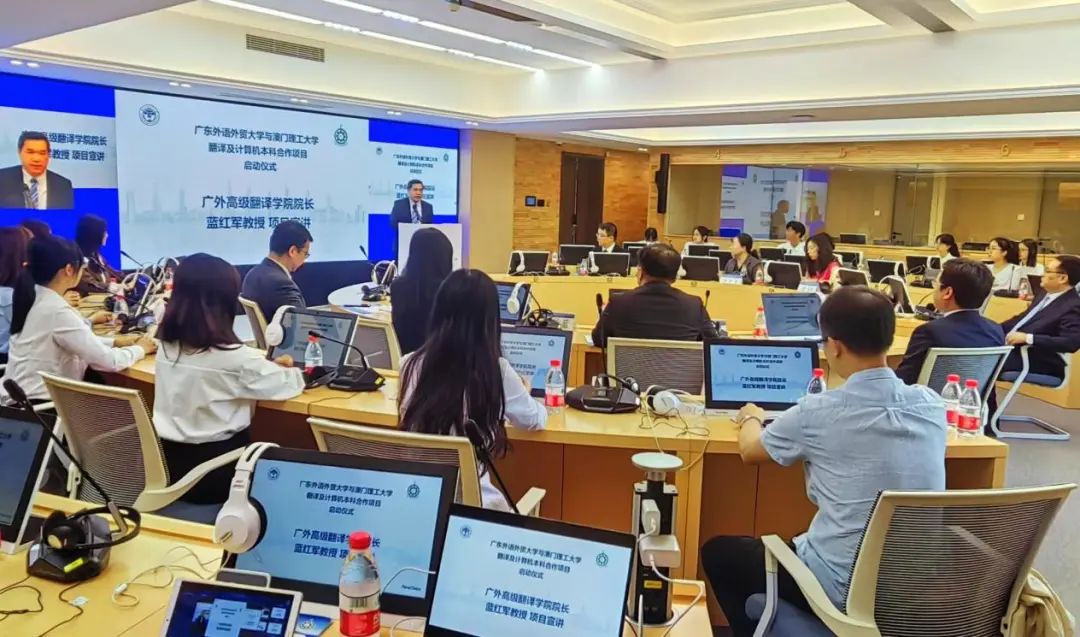 广外高级翻译学院院长蓝红军和澳门理工大学应用科学学院代院长林灿堂进行项目介绍。