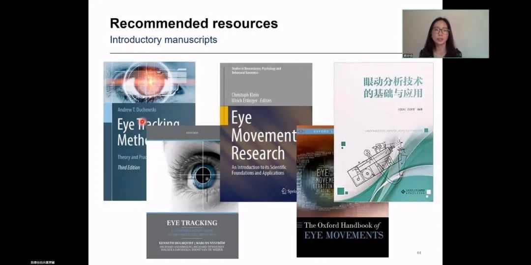 在讲座的尾声,陈思佳教授分享了眼动追踪研究的相关资源,包括眼动追踪研究的入门书籍,如外文的《Eye Tracking Methodology》与中文的《眼动分析技术的基础与应用》,眼动方法奠基的文献、阅读研究相关的文献以及口笔译相关的文献,有关眼动追踪研究的网页与公众号,眼动研究的一些开源公共数据集,进行眼动研究数据换算的工具,等等。