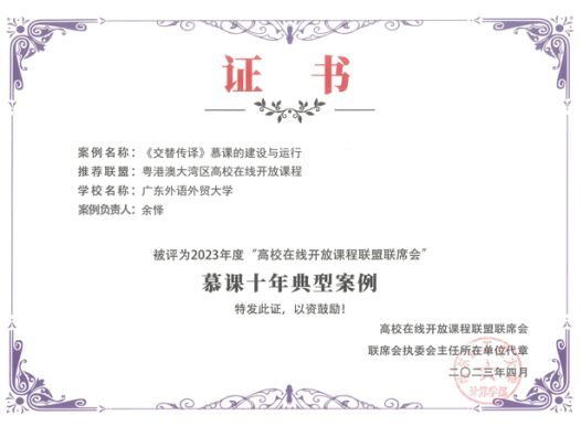 近日,全国慕课教育创新大会(第四届)暨高校在线开放课程联盟联席会2023年会在广州举行,大会主题为“中国慕课十年的总结与展望”。大会发布了“慕课十年典型案例”,我校翻译学院余怿老师主持的《交替传译》课程入选。