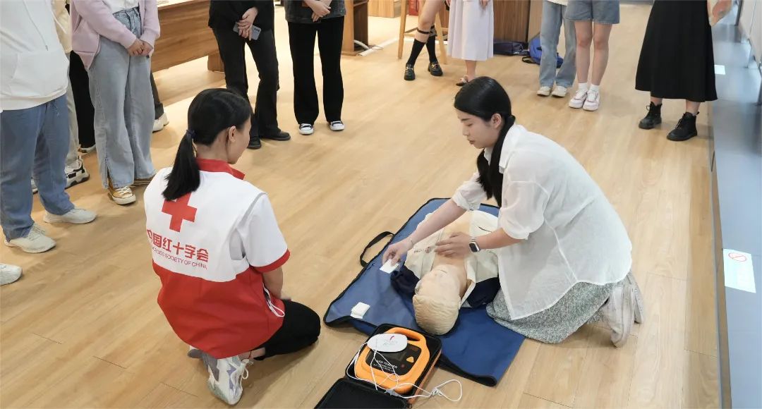 此次讲座由中国红十字会广州备灾救灾中心讲师廖飈玲主讲,分为基础理论学习、现场演示实操两部分。廖飈玲从红十字运动的起源讲起,向同学们介绍了红十字的精神、红十字会原则、主要工作等。接着,她介绍了现场心肺复苏程序、气道异物梗阻急救方法、AED使用方法共三个知识点,并通过现场救护技巧演示和救护实例,分析讲解应急救护五大原则,激发了同学们学习救护知识的意愿。
