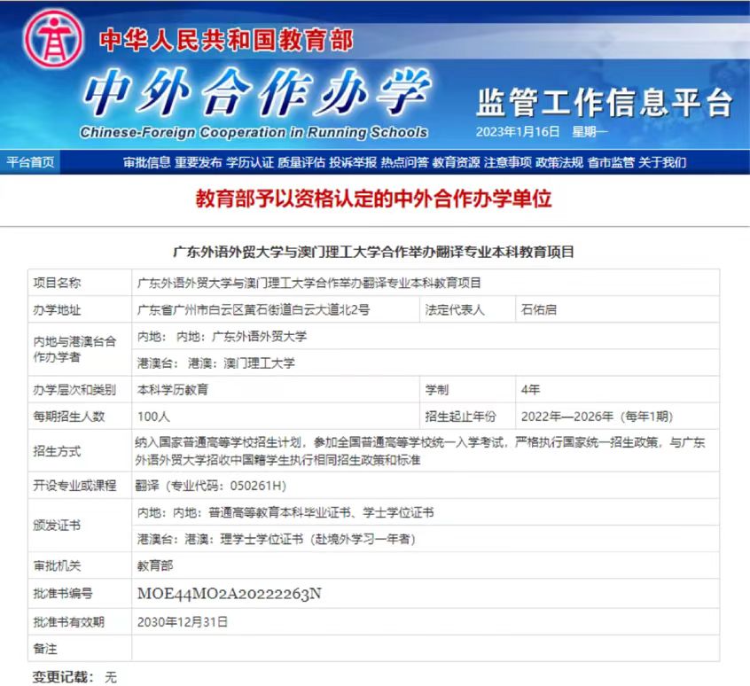 3月,经教育部批复,同意我校与澳门理工学院合作举办翻译专业本科教育项目。预计2023年起入驻知识城,首批招生计划人数为100名。国际治理创新硕士研究生项目是学校国际治理创新研究院与马里兰大学共同合作的国际组织人才培养项目,国际治理创新研究院拟录取53名研究生为国际治理创新硕士研究生项目2022级学员。