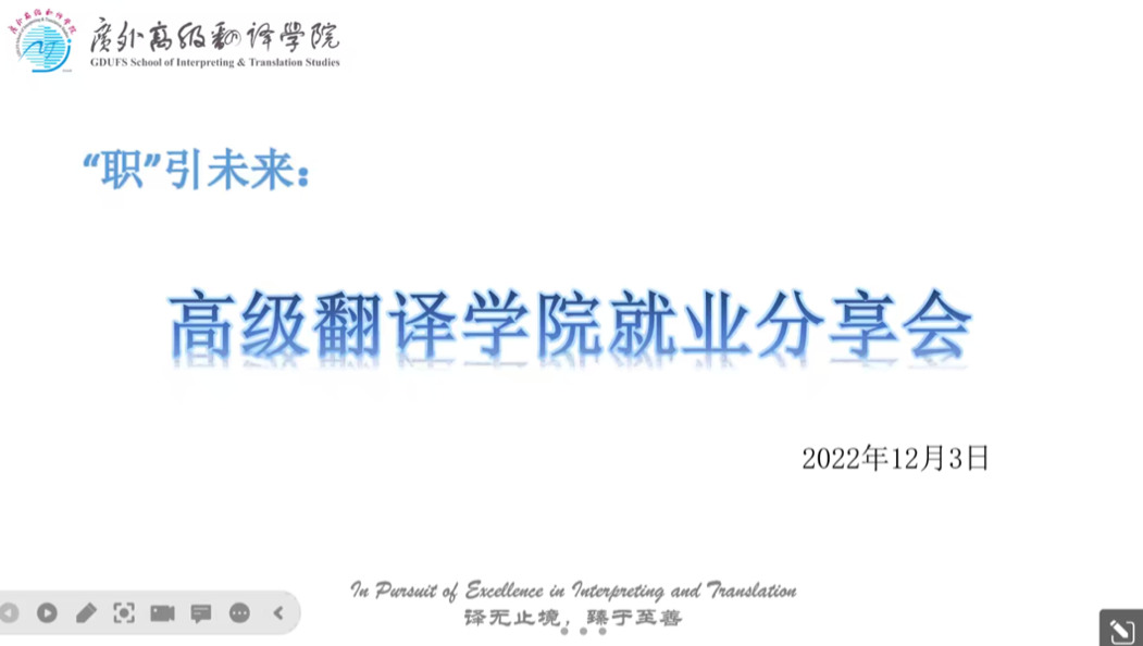 12月3日,由广东外语外贸大学黄埔研究院主办,高级翻译学院承办的“职引未来”职业分享沙龙第14期在线上顺利举办。为更好地帮助同学们了解就业形式、明确职业方向、做好职业生涯规划,本次分享会特邀高级翻译学院4位优秀毕业生进行就业经验分享,吸引来自不同年级专业的研究生参加。