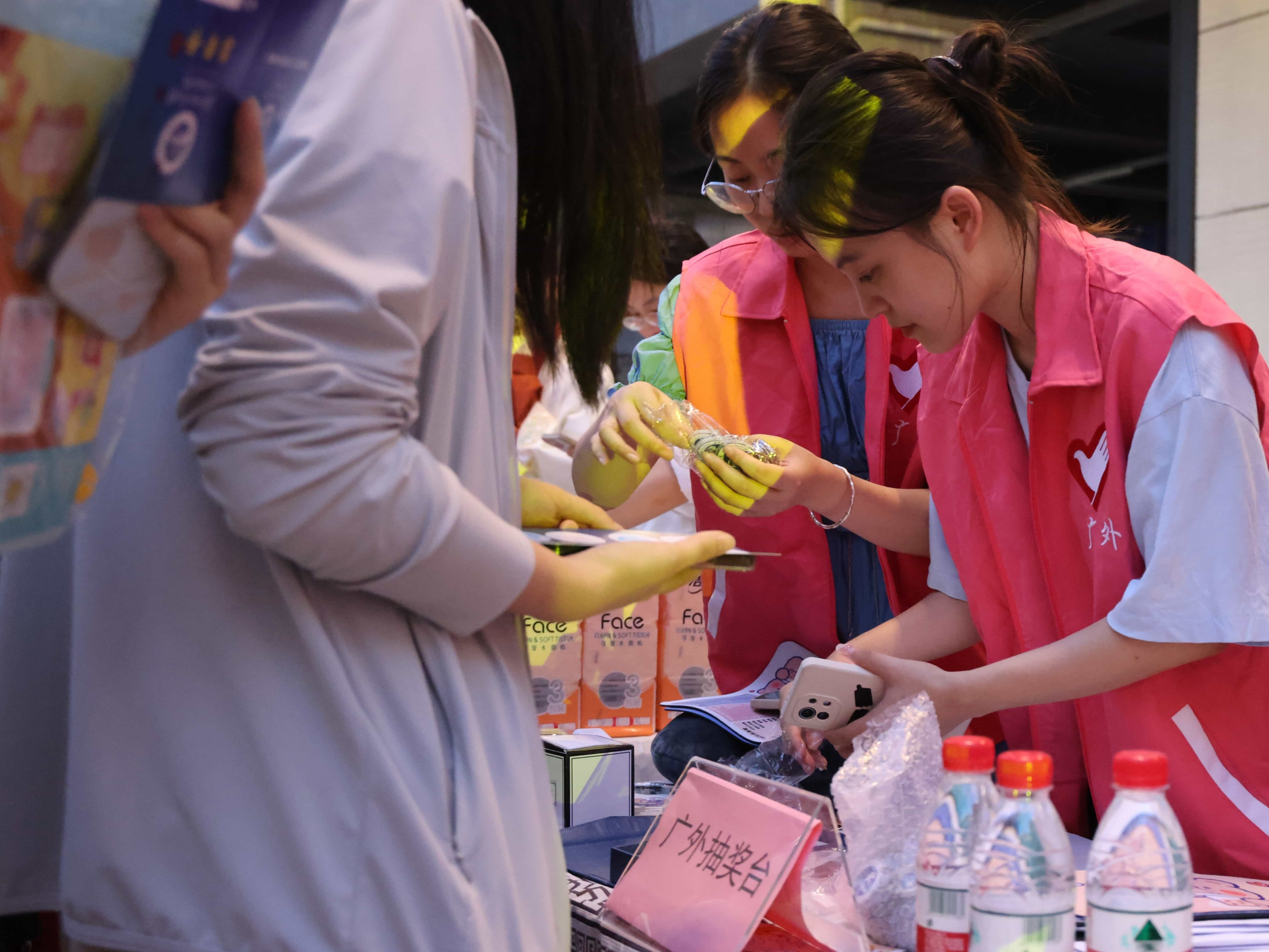 在游园会抽奖区,有为同学们准备的多种广外专属小奖品,同学们拿着游戏战利品——广外专属印花,满怀期待地抽出属于自己的奖品,现场一阵欢声笑语。