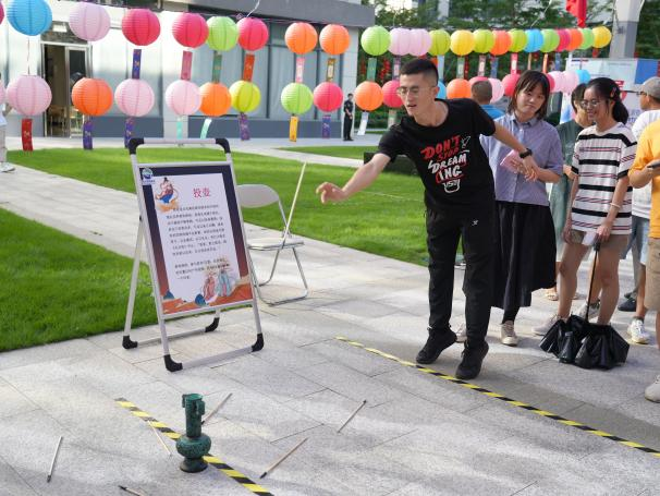 整个游园会分成了七个区位:“DIY灯笼”“DIY月饼”“团队默契大考验”“投壶”“七步之才”“妙手画扇”“许心愿·寄憧憬”。众人在此间体会了手绘团扇的风雅意趣,忆起了儿时朗朗上口的魅力诗歌,也以物寄情,将一份心思托于亲制的月饼之上。又或是携上三两好友,来一次默契考验,拼一回投壶技巧,再诚心写下一份愿景,一同挂上高处。