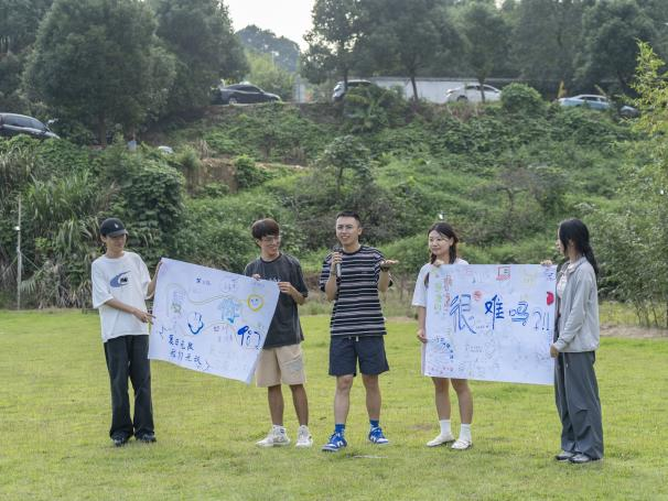 23日上午,同学们乘坐大巴车到达素拓现场。为了促进同学之间的交流、增进同学之间感情,同学们被随机分成4个小组,并开展各项破冰游戏。在队伍展示环节,各队大声喊出自己的队名和口号,秀出精心彩排的舞蹈,向大家介绍自己的队伍。现场气氛热烈,掌声、喝彩声此起彼伏,欢声笑语充满草地。