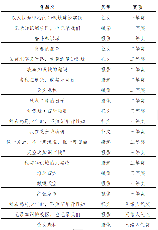 以“奋进知识城,青春正年华”为主题,大赛设置征文、摄影、摄像三个类型,自发布以来,受到园区高校研究生和广外南北校区本科生的高度关注,同学们参与热情高涨,积极投稿。经过初审共有36份作品入围,根据自愿参与的原则,共有32个作品进入线下评审环节。