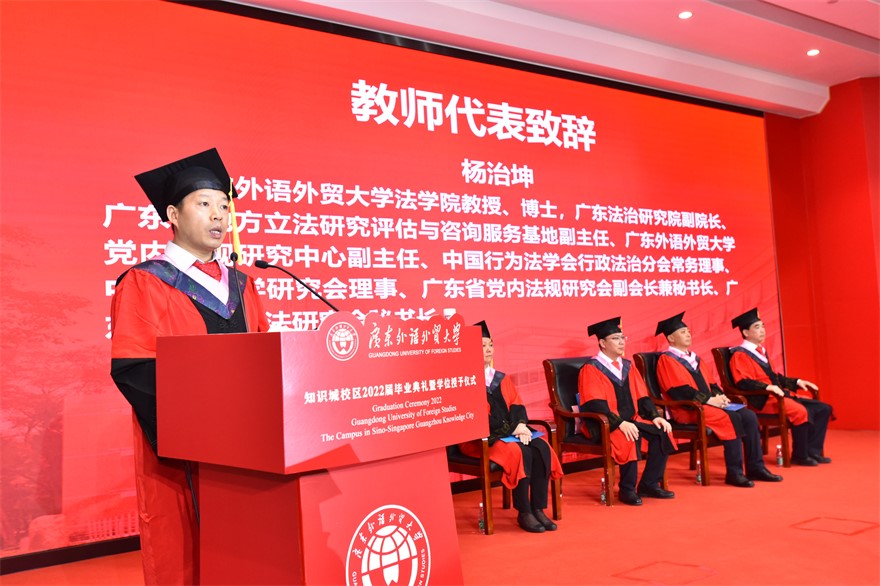 教师代表、法学院教授杨治坤在致辞中表示,面对可能的挫折,面对可能的失败,请学会与不完美相伴,矢志不渝地在不完美中砥砺前行。他勉励同学们要坚守志业,这是安身的不竭源泉;保持对法律敬畏,这是立命的护身符;谨守良知,这是安放灵魂的“定海神针”。