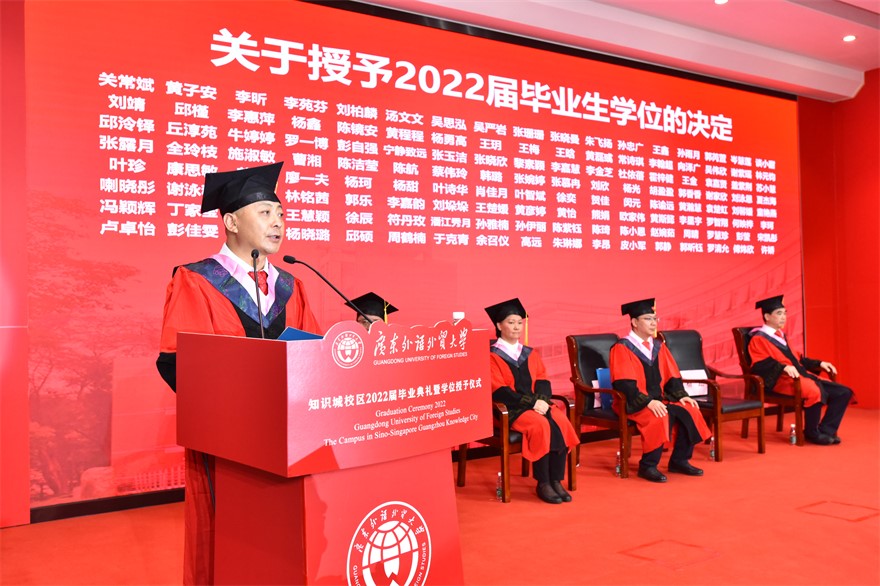 6月23日,我校知识城校区2022届毕业典礼暨学位授予仪式在海丝知识中心举行。校党委常委、副校长刘海春等五位主礼教授为知识城校区首批研究生毕业生颁发学位证书,寄语毕业生们前程似锦、未来可期。