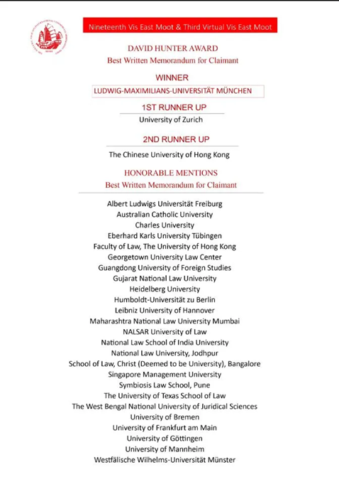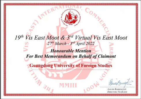 近日,第十九届Vis East国际商事仲裁模拟仲裁庭比赛(Willem C. Vis East International Commercial Arbitration Moot)于线上举行。经过四天循环赛的激烈角逐,广外法学代表队从来自世界各国的140支队伍中脱颖而出,获得申请方最佳书状荣誉提名(位列全球第十)。在本次比赛中,我院代表队是中国大陆高校参赛队伍中唯一获得申请方最佳书状荣誉提名奖的队伍,实现了广外法学在该国际赛事中的历史性突破!