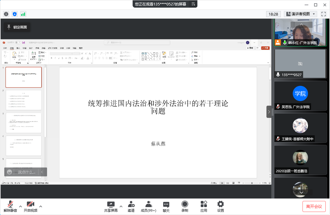 蔡从燕教授讲授立足于新时代的发展,蔡从燕教授着眼于国内国外两个视角,从背景、目标、内容、方法论这几部分介绍统筹推进国内法治和涉外法治中的“统筹”问题。蔡从燕教授围绕“统筹”这一关键词,简要介绍了“统筹”一词在中国共产党历史上发挥的重要作用。蔡从燕教授强调,统筹推进国内法治和涉外法治应当同时追求建设中国图景与世界图景中的“法治中国”,实现对内事务与对外事务的“全面法治”,平衡维护国家主权、安全与发展利益之间的需求,以及兼顾中国国家利益与国际社会利益。此外,不同于以往从立法、执法、司法以及涉外法治人才培养等方面理解统筹推进国内法治和涉外法治,蔡从燕教授认为统筹推进国内法治和涉外法治应当在制度、行为体、机制以及场所等方面进行恰当的建构、动员与选择。最后,蔡从燕教授指出,统筹推进国内法治和涉外法治更要解决具有根本重要性的方法论选择,即涉外法治遵循“正常化”抑或“例外主义”逻辑。与谈环节,张亮教授谈到,“统筹”作为推进国内法治和涉外法治的方法论,我国应当从整体治理出发,在法治轨道上协同国内事务与对外事务,在统筹国内法治与国外法治发展中实现中国利益的最大化,推进国家治理体系与治理能力的现代化。向明华教授高度认可蔡从燕教授在推进国内法治和涉外法治中需要平衡维护国家主权、安全与发展利益的观点。他以我国《海商法》修订为例,强调既要谨防对国家安全利益的泛化解释,又要权衡短期利益与长期利益的关系。此外,还应当辩证看待“统筹”问题,对“统筹”作狭义的解释,他认为“统筹”只有建立在充分的信息基础上,才能做出科学合理的决策。提问环节,师生们就在环境治理中如何统筹推进国内法治和涉外法治、在涉外法治和对外关系法语境下的“对外事务”的识别、私行为体在统筹推进国内法治和涉外法治中的作用等问题向蔡从燕教授提问。蔡从燕教授为大家一一解答,深入讨论。讲座学术讨论氛围浓烈,引起了同学们对于统筹推进国内法治和涉外法治强烈的共鸣与反响。同时,本次讲座还吸引了来自厦门大学、武汉大学、中山大学、华南师范大学等高校的师生参与。最后,韩永红教授对蔡从燕教授的精彩讲座表示感谢,同时感谢与谈嘉宾、老师、同学的热情参与,并期待蔡从燕教授在疫情结束后莅临广外指导。