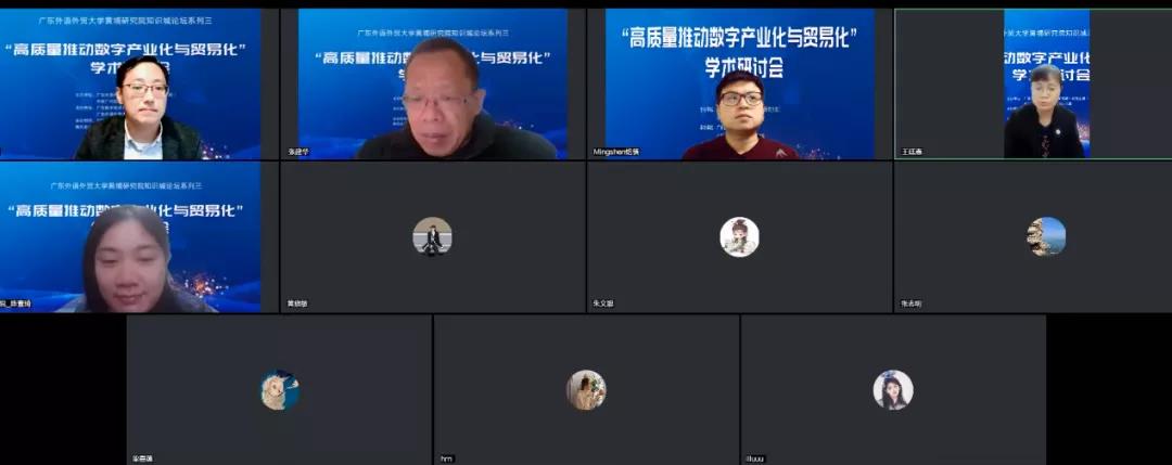 2022年1月23日,由广东外语外贸大学黄埔研究院(研究生院)、中新广州知识城开发建设办公室主办、广东数字经济与贸易研究院和广东外语外贸大学经济贸易学院共同承办的广东外语外贸大学黄埔研究院知识城论坛系列之三——“高质量推动数字产业化与贸易化”学术研讨会在线上召开,共有七位专家学者及业界人士作了主题发言,分别是广东外语外贸大学副校长、广东外语外贸大学黄埔研究院(研究生院)院长王廷惠教授,中国宏观经济研究院经济研究所企业室副主任张铭慎副研究员,广东外语外贸大学经济贸易学院张志明副教授,广东外语外贸大学经济贸易学院陈寰琦博士,中健领航科技有限公司吴锡佳总裁,《国际商务研究》编辑部张建华主任,研讨会由广东外语外贸大学经济贸易学院梁俊伟副教授主持。同时线上有进100名来自不同高校的学者和博士生参加,会议就如何高质量推动数字产业化、贸易化以及多双边贸易协定中数字贸易规则与价值链合作等学术问题展开了深入讨论。