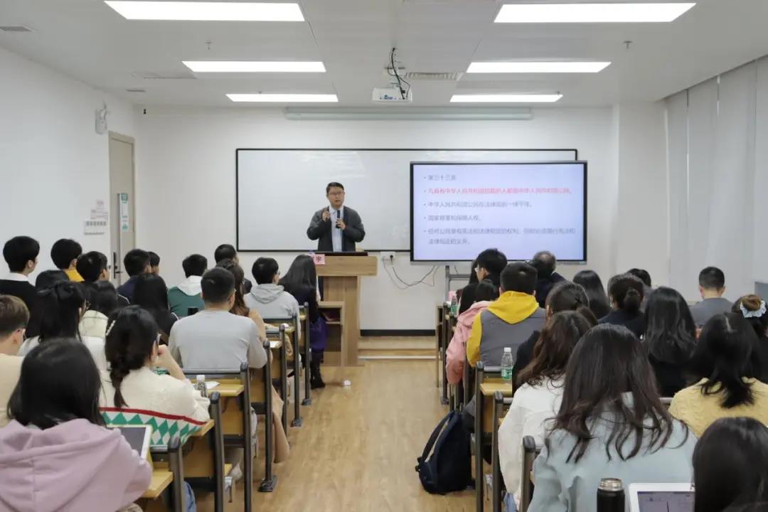 最后,广东外贸外贸大学讲师、云山青年学者谢宇博士进行“增强宪法意识,树立宪法权威”普法讲座。谢宇从解读宪法条文入手,带领全体师生读懂宪法、了解宪法、认识宪法。从宪法的内容、程序、修改、效力等方面系统阐述了宪法是根本大法的缘由,从各大部门法对比的角度讲述了宪法是母法的重要地位,从真实案例中回顾了为什么要坚决依宪治国,保障人权。谢宇提出,希望参会学生能进一步坚定宪法自信,鼓励同学们加强对宪法的理论研究与实践应用。
