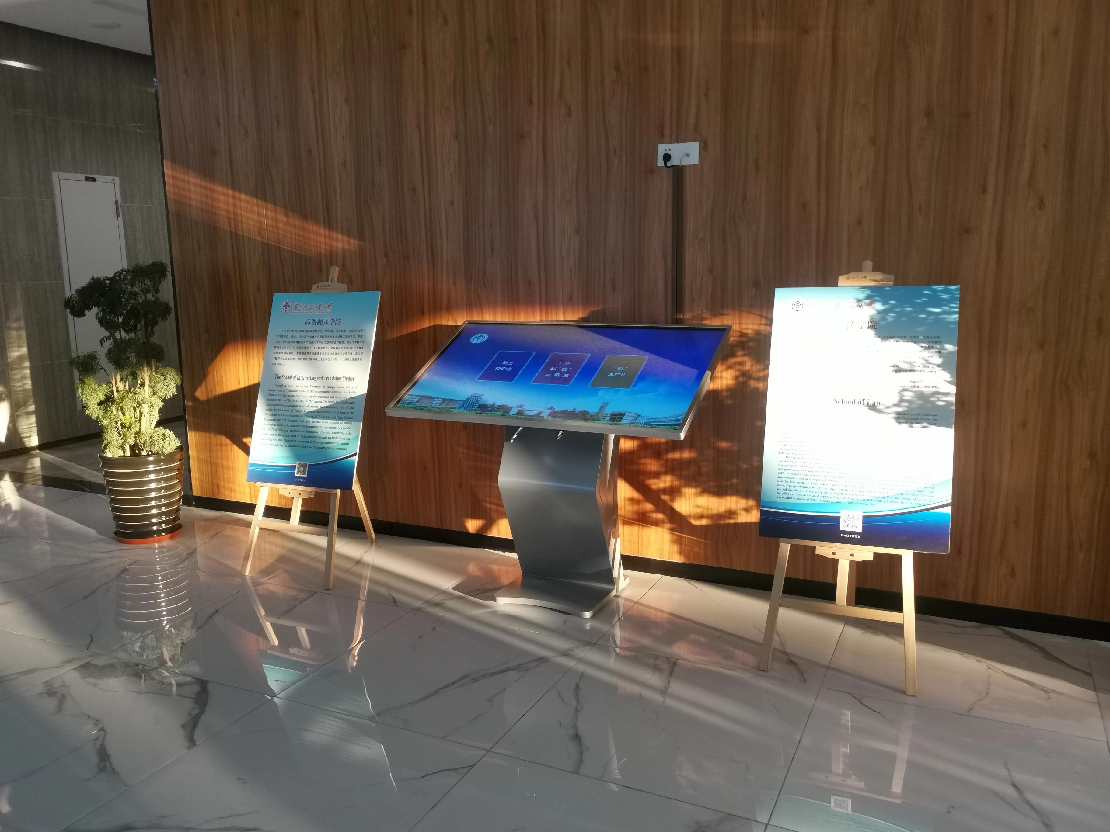 在知识城校区教学楼增设校史展览一体机能让同学们便捷快速地了解到广外的历史与发展成果,增强同学们的集体荣誉感与归属感。