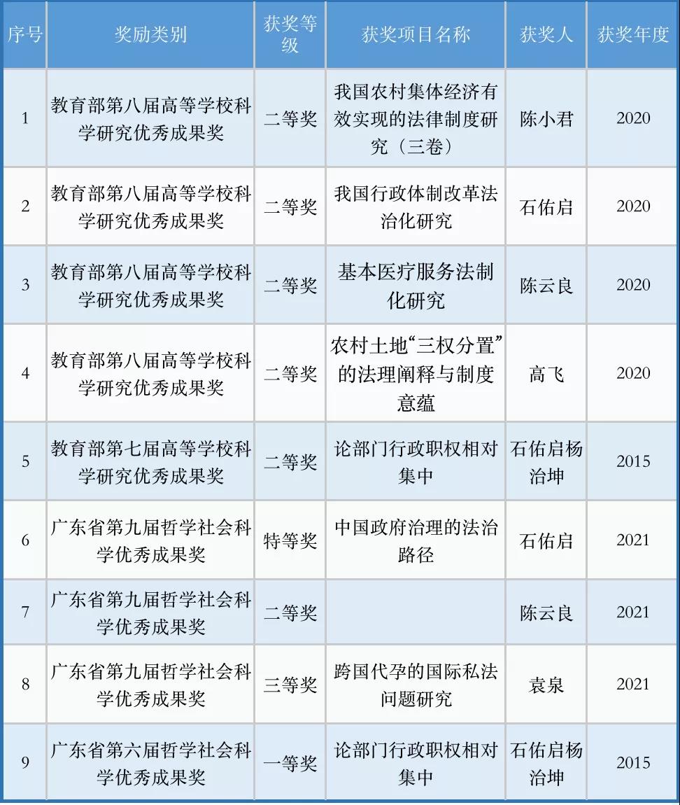 近五年,法学学科承担了2项国家社科重大项目、3项教育部哲学社会科学研究重大课题攻关项目、20余项国家社科重点等类别项目。在《中国社会科学》《法学研究》《中国法学》等权威和核心期刊发表论文近200篇,在人民出版社、法律出版社等出版专著50余部,获得高校人文社科优秀成果二等奖、广东省哲学社会科学优秀成果一等奖、吴玉章人文社会科学青年奖、钱端升法学优秀成果奖等20余次。2021年9月26日,国家教材委员会发布《关于首届全国教材建设奖奖励的决定》,陈小君教授担任首席专家之一、高飞教授参与编写的教材《民法学》获一等奖。
