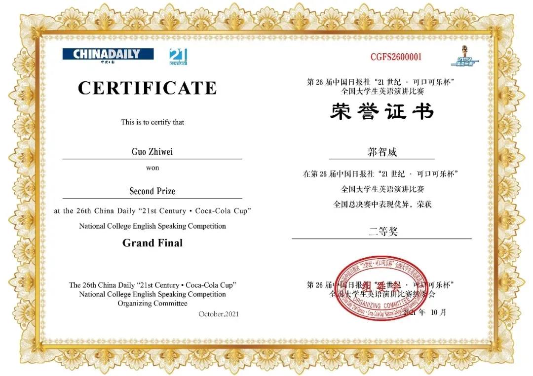 10月4日至6日,第25届中国日报社“21世纪杯”全国大学生英语演讲比赛总决赛在四川成都的“中国—欧洲中心”举行。翻译学院教授陈朗带队参赛,我校2019级翻译专业学生郭智威取得全国二等奖的好成绩。