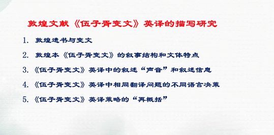 首先,桑教授对敦煌遗书进行了简要介绍,主要包括敦煌遗书中的叙事文献和叙事文献类别下的变文。敦煌遗书包括清代以来在古敦煌境内出土的古代文献和在外地发现的敦煌古文献。叙事文献作为通俗文学,衔接了唐传奇与宋元以来的话本、宝卷、诸宫调等文学类型,在中国文学发展史上,具有承上启下的作用。因此,近年来敦煌叙事文献愈发受到学术界关注。变文是吸收中亚的佛教文学体制而形成的一种讲唱、散韵结合的俗文学体式,其文字表述中常配有插图。汉学家威利与梅魏恒均选译英雄叙述类文献《伍子胥变文》,说明其在敦煌俗文学大类中的典型性。