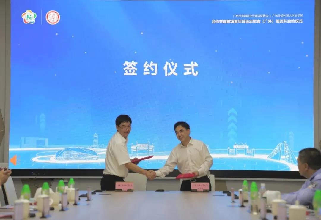 仪式上,黄埔区社会建设促进会秘书长钱澄青和广东外语外贸大学法学院院长陈云良共同签署了“黄埔青年普法志愿者服务队”合作共建协议。