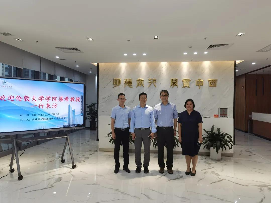 2021年4月21日,英国伦敦大学学院梁希教授来访我校黄埔研究院,洽谈中外合作办学。知识城建设办副主任徐晖、黄埔研究院执行院长李青、广外国际交流处副处长周鹏、广东国际战略研究院办公室主任林泽龙等陪同参观,并参与洽谈。