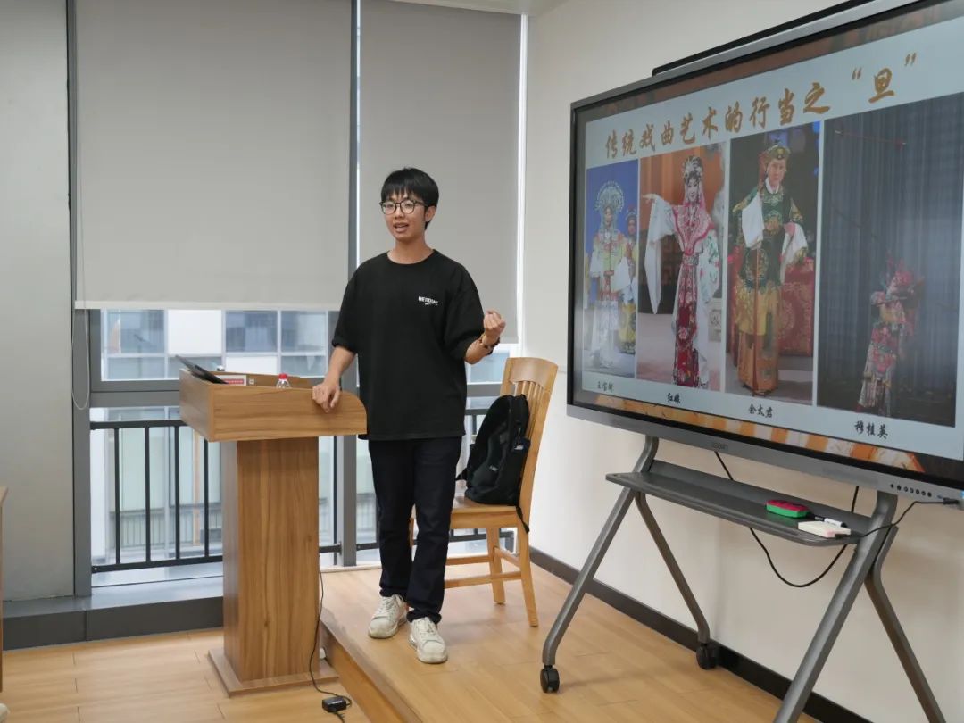 活动伊始,“偶具匠心”团队陈俊廷同学深入浅出地介绍了传统戏曲艺术的行当“生旦净丑”以及色彩心理学中的“正五色”概念,让同学们对戏曲艺术有了初步的认识。他详细讲解了不同脸谱的特征及其颜色和线条所代表的性格特点,让同学们对戏曲角色有了更加直观和深入的理解。主讲人的演讲声情并茂,同学们听得津津有味,仿佛置身于戏曲的世界之中。