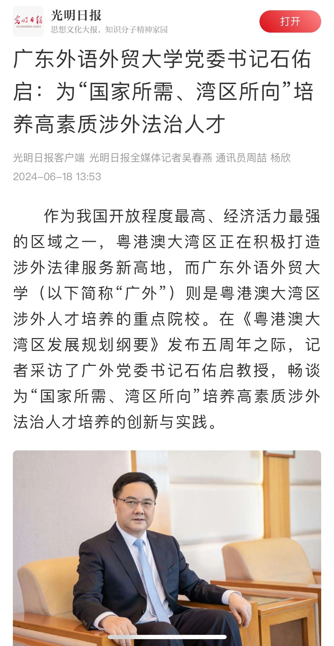 作为我国开放程度最高、经济活力最强的区域之一,粤港澳大湾区正在积极打造涉外法律服务新高地,而广东外语外贸大学则是粤港澳大湾区涉外人才培养的重点院校。在《粤港澳大湾区发展规划纲要》发布五周年之际,光明日报记者采访了广外党委书记石佑启教授,畅谈为“国家所需、湾区所向”培养高素质涉外法治人才的创新与实践。