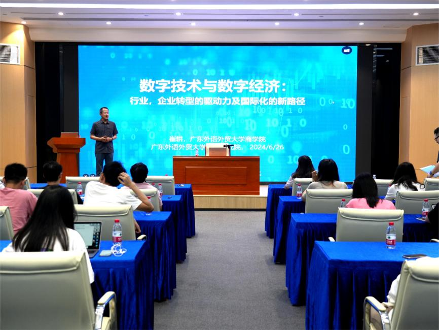 6月26日,“科教论道 产研创投”高端人才沙龙活动在海丝知识中心W1栋三楼报告厅顺利举办。广东外语外贸大学商学院、香港岭南大学商学院市场营销及国际商学系教授、国际商学会(AIB)亚太分会执行理事崔耕教授应邀开讲主题为“数字技术与数字经济:行业,企业转型的驱动力及国际化的新路径”的学术讲座。知识城校企创新创业联合会副秘书长高晨、相关企业代表及海丝园区师生参加本次讲座,活动由黄埔研究院办公室主任陈琦光主持。