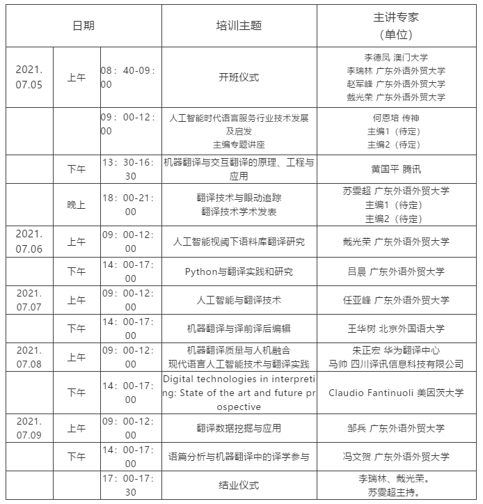 人工智能自诞生以来,理论和技术日益成熟,应用领域也不断扩大,其在翻译教学、科研及实践中也发挥着越来越重要的作用。为提升广大师生的翻译技术应用能力和科研能力,广东外语外贸大学高级翻译学院将于2021年7月5日至7月9日开设2021年人工智能与翻译暑期工作坊。本次工作坊历时5天,主讲专家既有来自包括华为、腾讯、传神、译讯等知名企业在内的人工智能与翻译领域的专家,也有学界知名主编及学术新秀,他们将为大家展现人工智能与翻译的广阔前景,涵盖内容广泛,包括七大模块:“人工智能与翻译实践和研究”、“语料库与翻译实践和研究”、“Python与翻译实践和研究”、“计算机辅助翻译”、“机器翻译与译后编辑”、“翻译技术学术发表”以及“翻译技术与眼动追踪”。由国内翻译技术学界与业界优秀的专家学者为学员分享理论知识与技术实践经验。