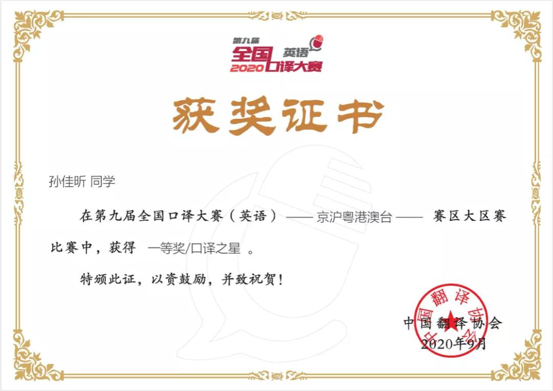 “做翻译首先要打好语言的基本功,比如语法,发音等等。同时要有多方面的知识储备,平时要坚持多读书多看报,不要排斥,要广泛地去学习各方面的知识。保持开放的心态,不要觉得自己做的是无用功,努力都是有意义的。希望学弟学妹们不要给自己设限,多去尝试一些不一样的东西。多听老师的建议,多去问一些问题,老师给的建议真的很有用。”